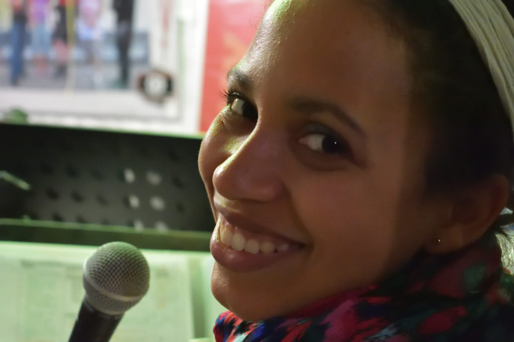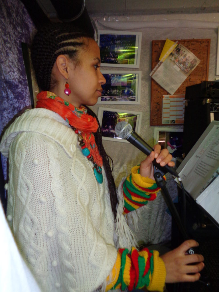 Nnandi singt Lead und Backing Vocals und sie singt mit einem SHURE SM 58 Microphone.